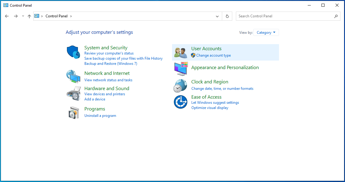 - When the Control Panel window opens, click on Change account type under User Accounts. You can use the search bar to locate the option.