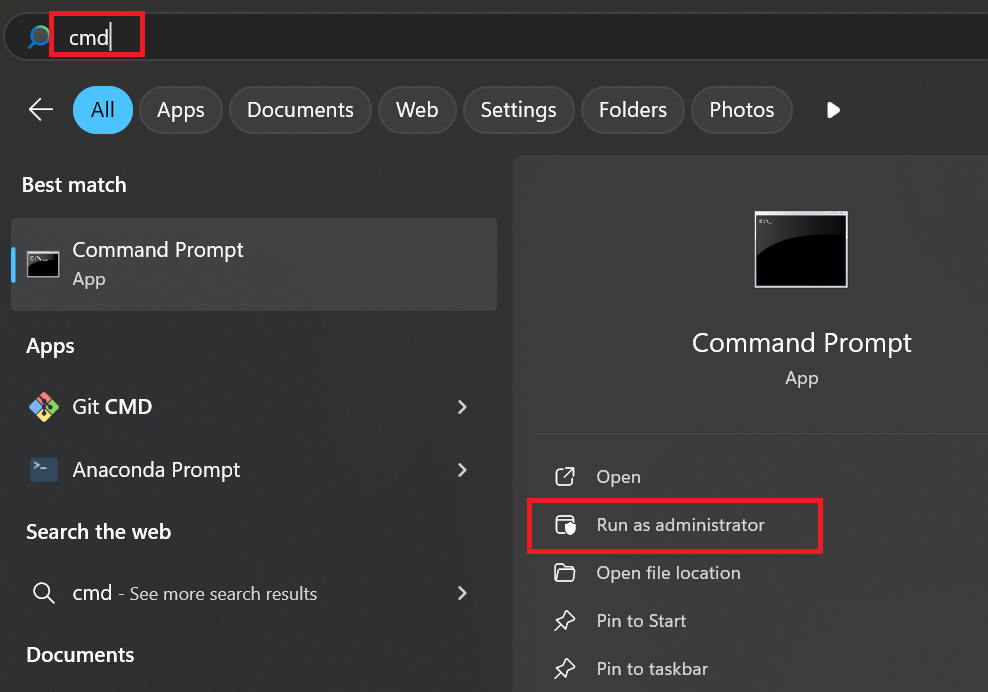 - Type cmd into your search bar and select the Run as administrator option under Command Prompt.