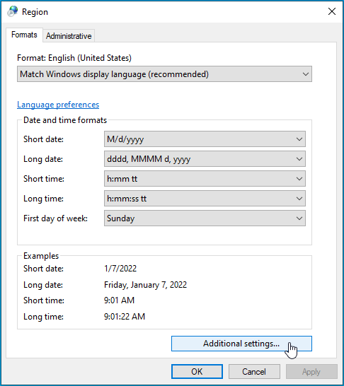 - From the results, open Control Panel and click on Change date, time or number formats.