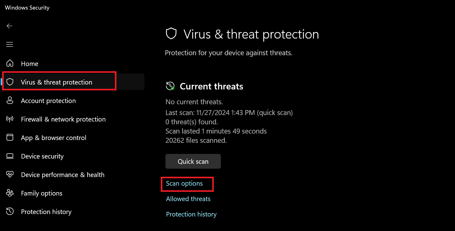 - On the left side of the screen, click Virus & threat protection. After that, click Scan options on your right.