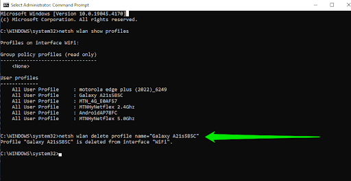 Replace the “Wi-Fi-profile-name” with the exact name of the network you want to remove as displayed by Command Prompt. Also ensure the network’s name is also in quotes.