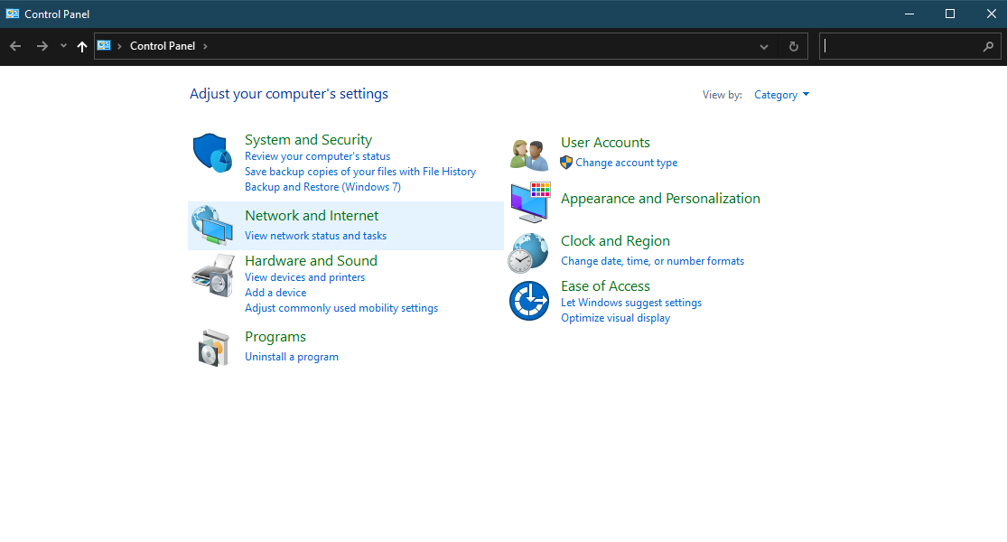 Control Panelin the search bar and click to open. - Click the Network and Internet option.