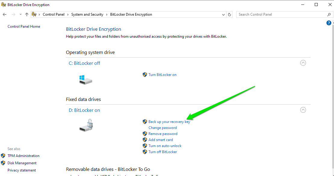 - Expand the drive with BitLocker turned on and click Backup your recovery key.