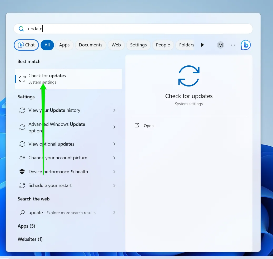 So, go to the Start menu, type update, and click Check for updates to find and install new Windows updates for your computer.