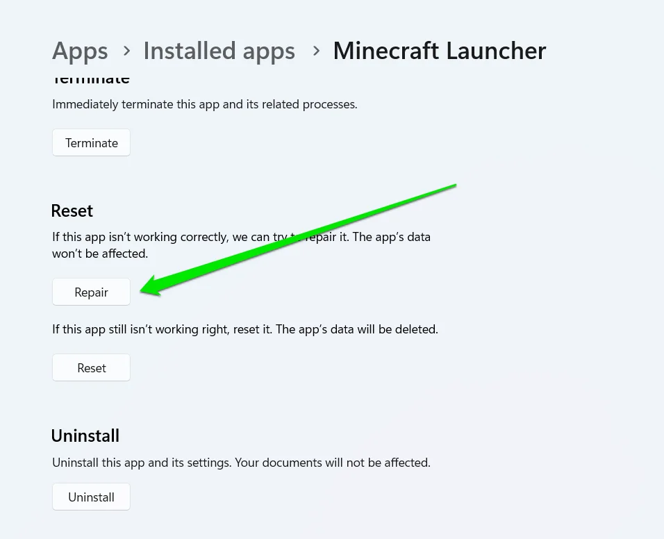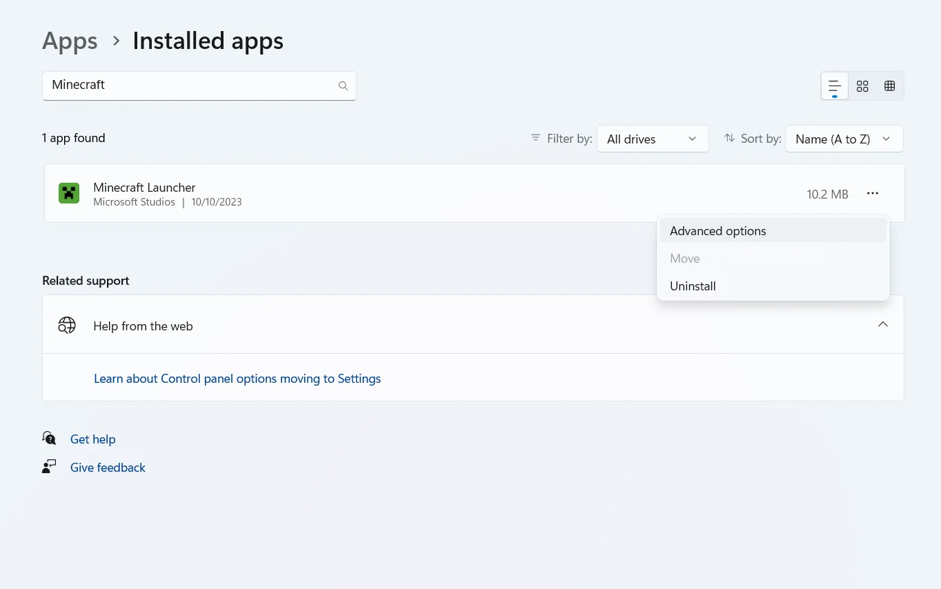 Minecraft. - If you’re on Windows 10, click the Minecraft Launcher entry and select Advanced Options. If you’re on Windows 11, click the three dots beside the launcher and choose Advanced Options.