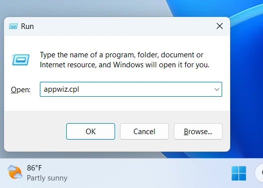 appwiz.cplinto the Run text box and hitEnteror click OK.