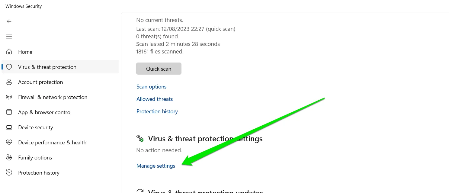 virus, and launch the Virus & Threat Protection utility. - Scroll down and click Manage Settings.