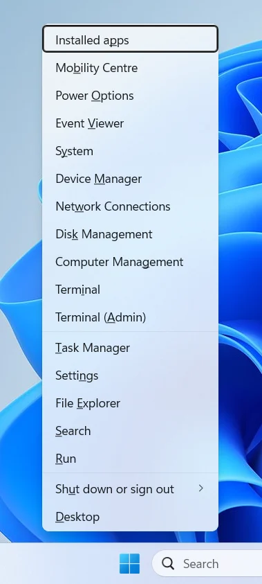 Windows + Xhotkey. - Click Installed Apps if you’re running Windows 11 and Apps and Features if you’re running Windows 10.
