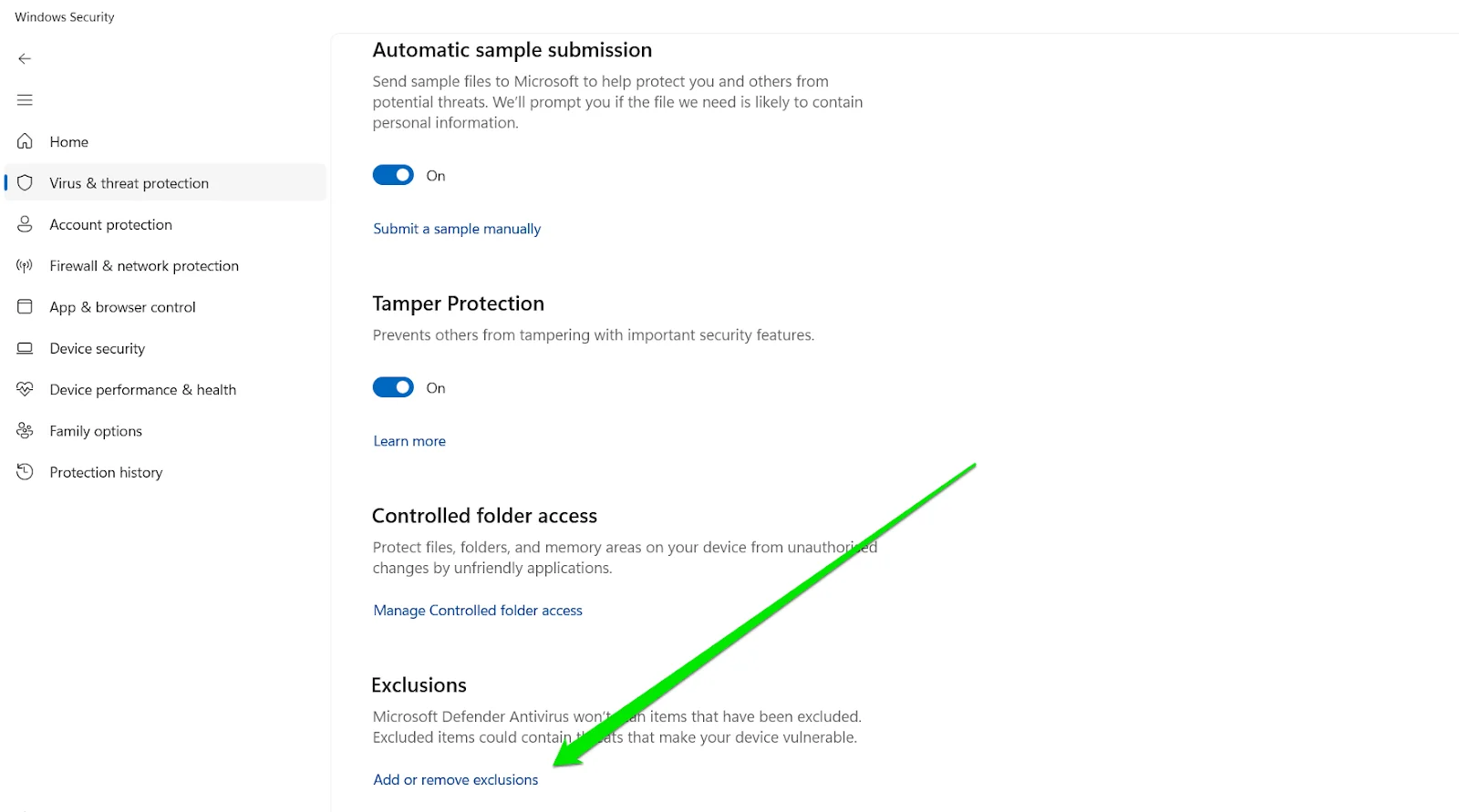 - Next, go to the bottom of the Virus & Threat Protection Settings page and click Add or remove exclusions.