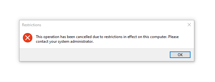 This operation has been canceled due to restrictions in effect on this computer.