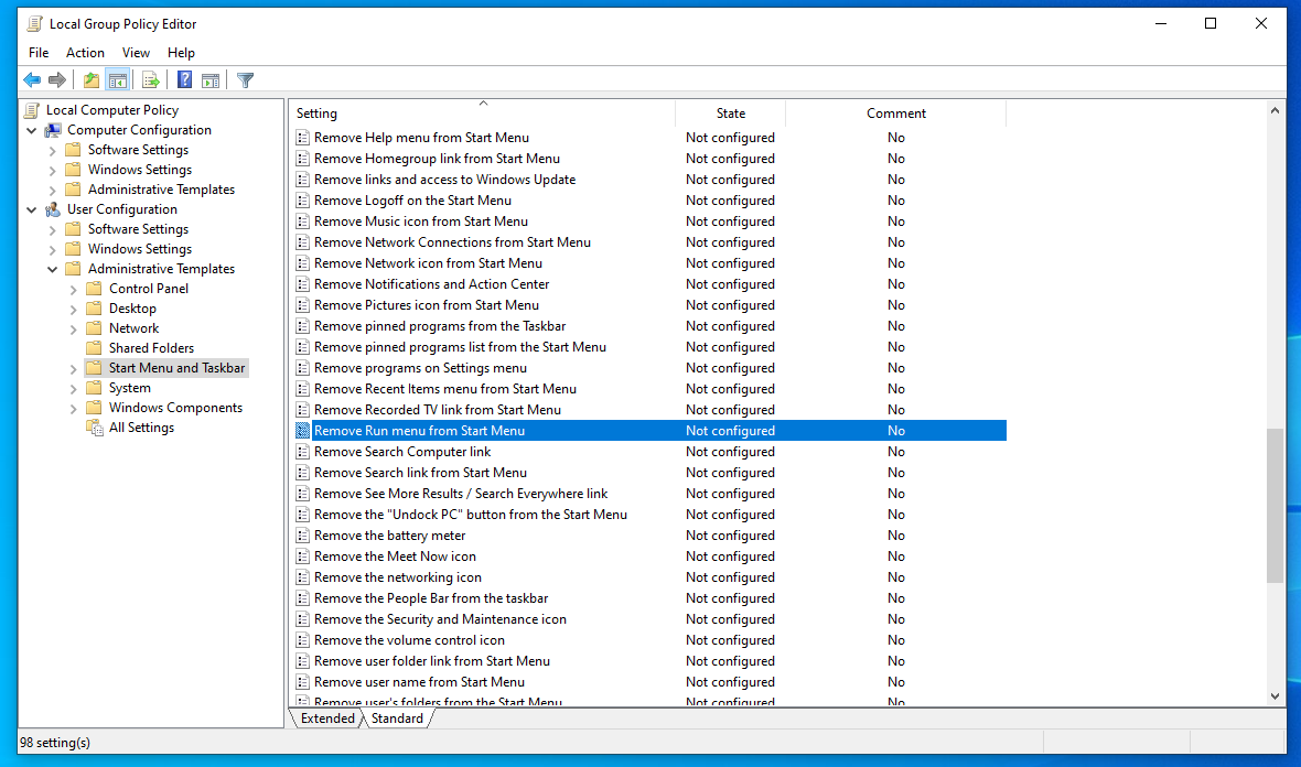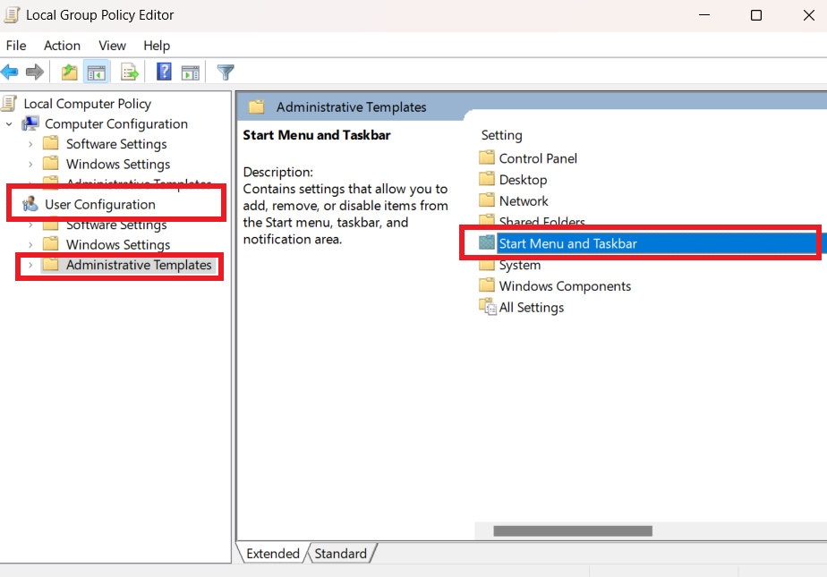 - Navigate to User Configuration -> Administrative Templates -> Start Menu and Taskbar.