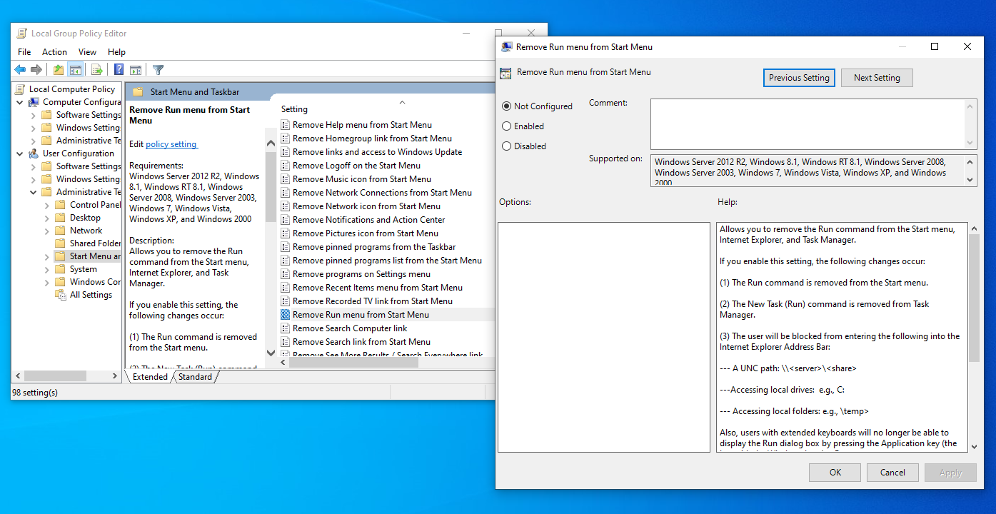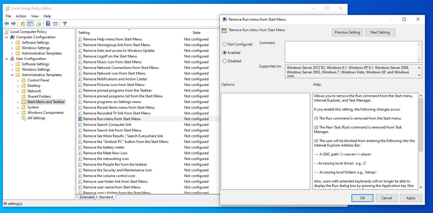 - Find and double-click Remove Run menu from Start Menu.