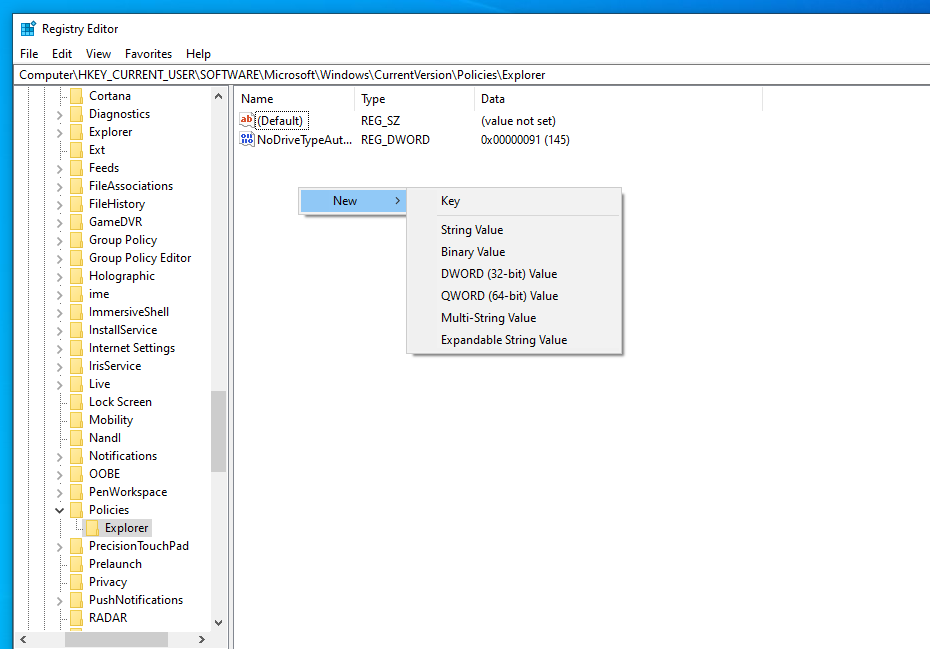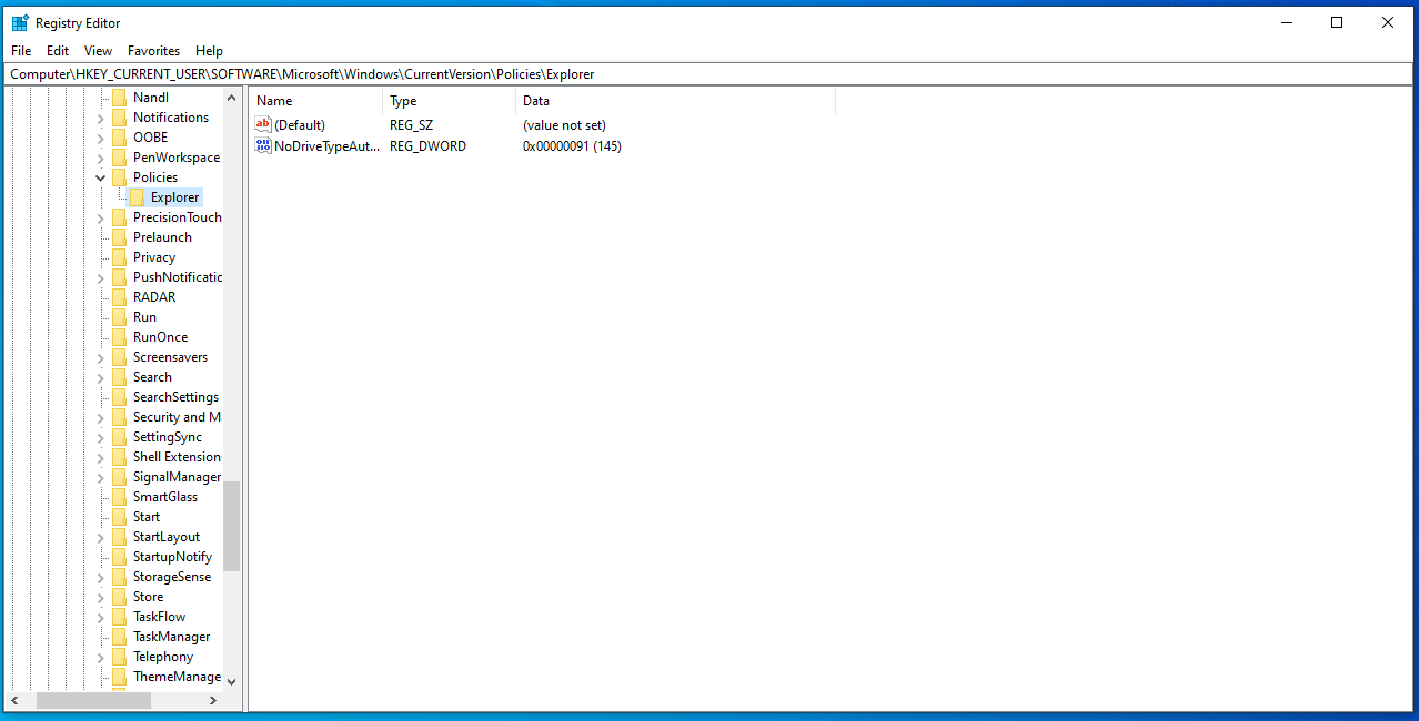 HKEY_CURRENT_USER\SOFTWARE\Microsoft\Windows\CurrentVersion\Policies\Explorer
