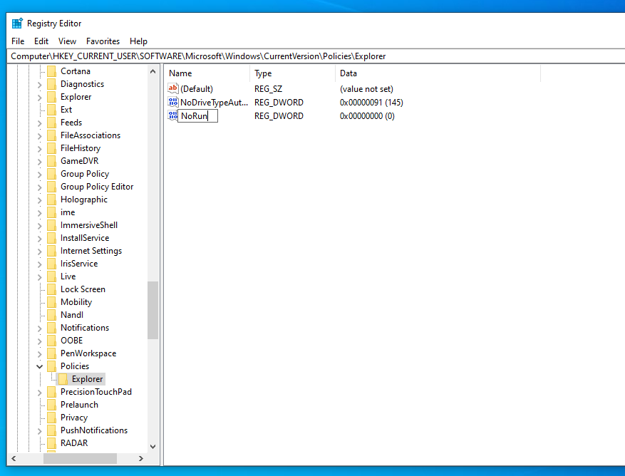 - Then, double-click the NoRun entry in the right pane and change the value in the Value data field to 0. Click the OK button and restart the system (or Explorer.exe).