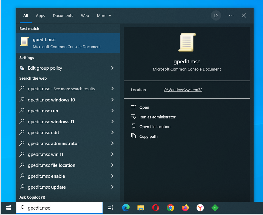 Windows Key + Sto open the search bar. - Type “gpedit.msc” and press Enter to open the Group Policy Editor.