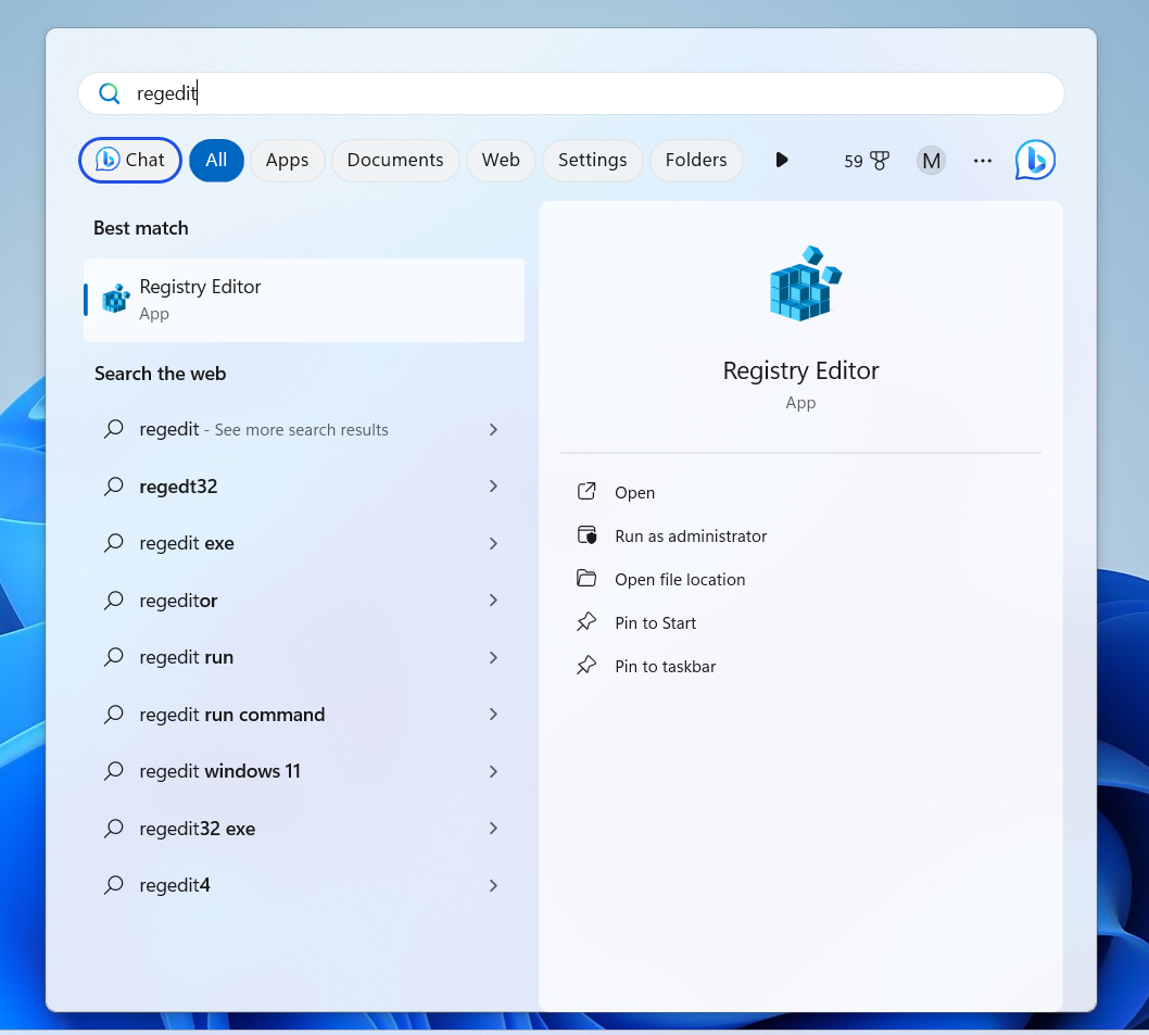 Windows Key + Sto open the search bar. - Type “regedit” and press Enter to open the Registry Editor.