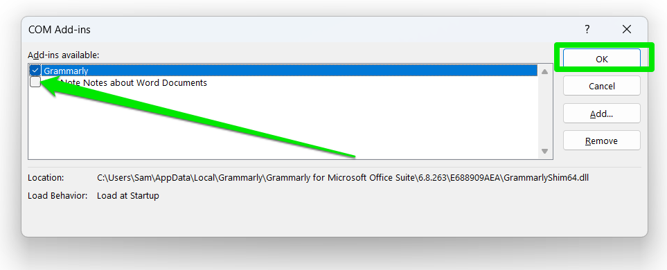 - When you see the COM Add-ins dialog box, make sure the box beside Grammarly is selected.