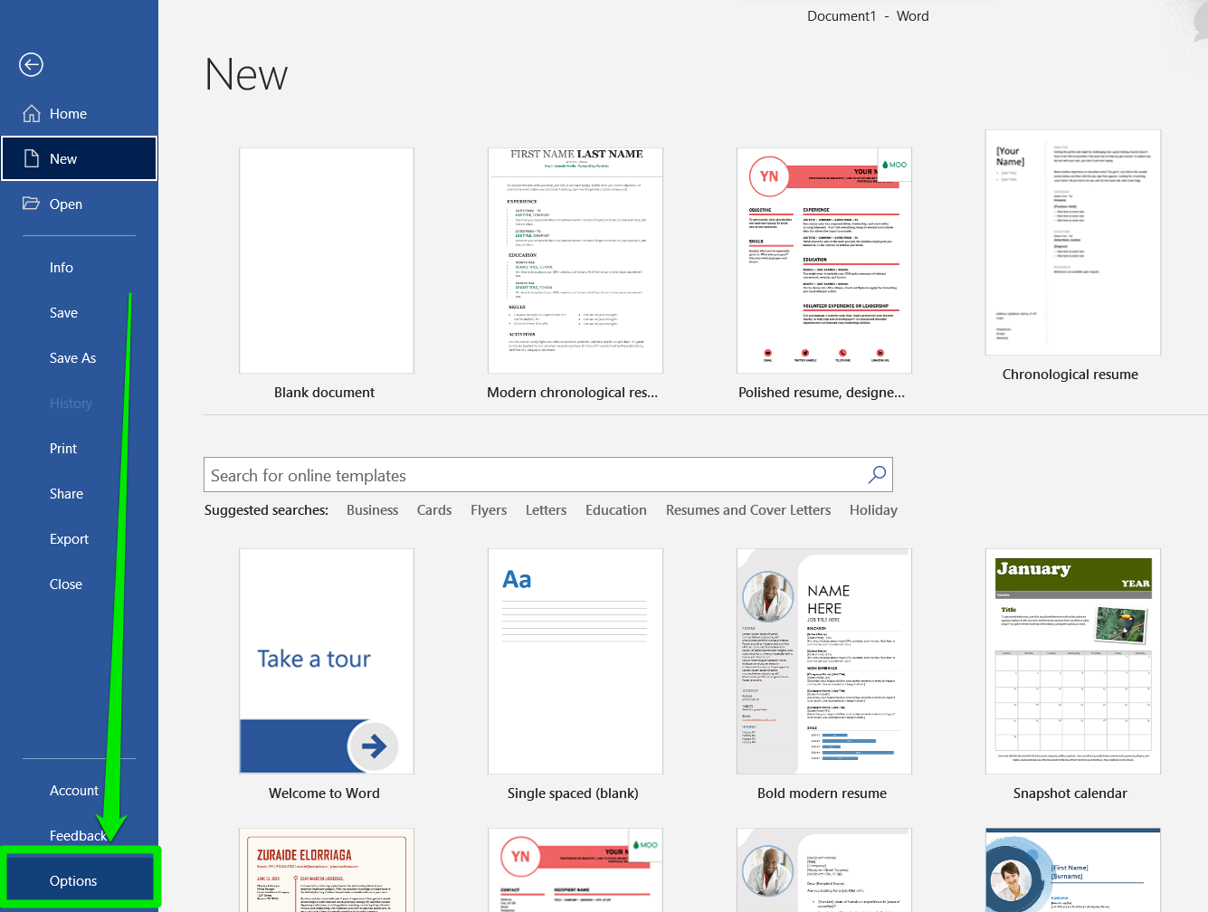- Go to the bottom of the left pane and select More, then click Options. In some Word versions, you just have to click Options.