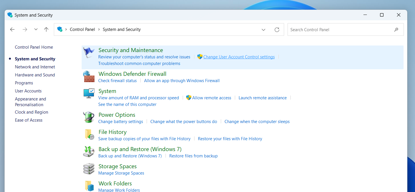 - On the System and Security interface, select Change User Account Control Settings under Security and Maintenance.
