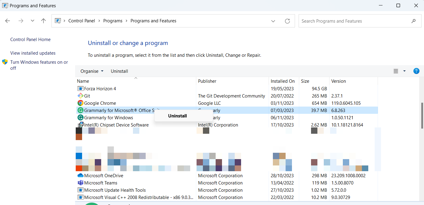 - Locate Grammarly for Microsoft Office Suite in the Programs and Features interface under the Uninstall or change a program list.