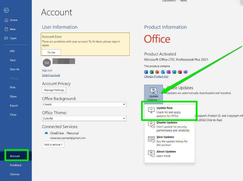 - Under Product information, click the Update Options button and select Update Now in the drop-down menu.