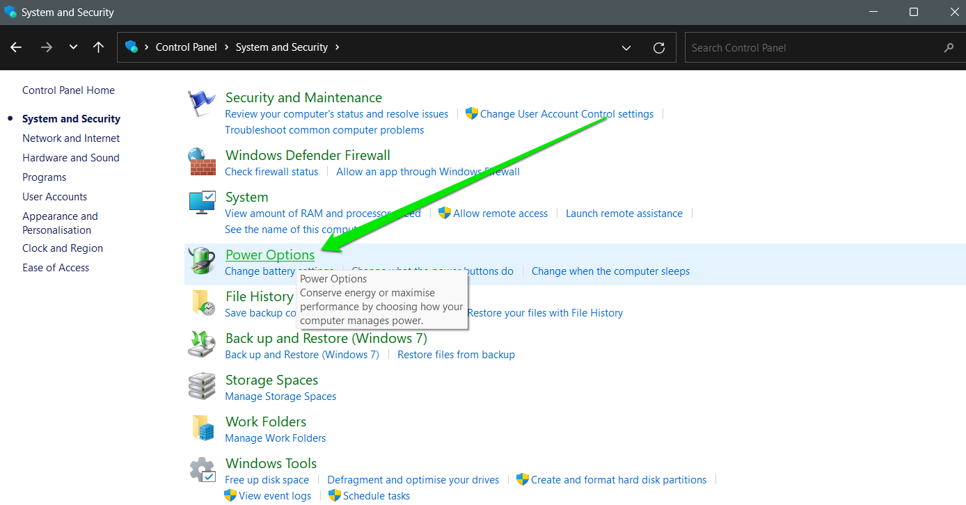 You can also go through the Control Panel window to change your power options. Follow these steps: