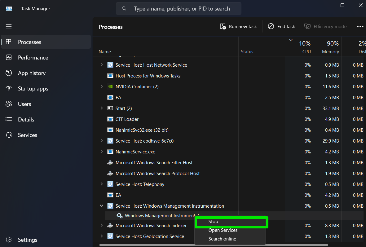 The WMI provider host typically displays under Service Host: Windows Management Instrumentation. You’ll see it under the Processes tab. Right-click it and select Stop. Click Shut down in the dialog window.